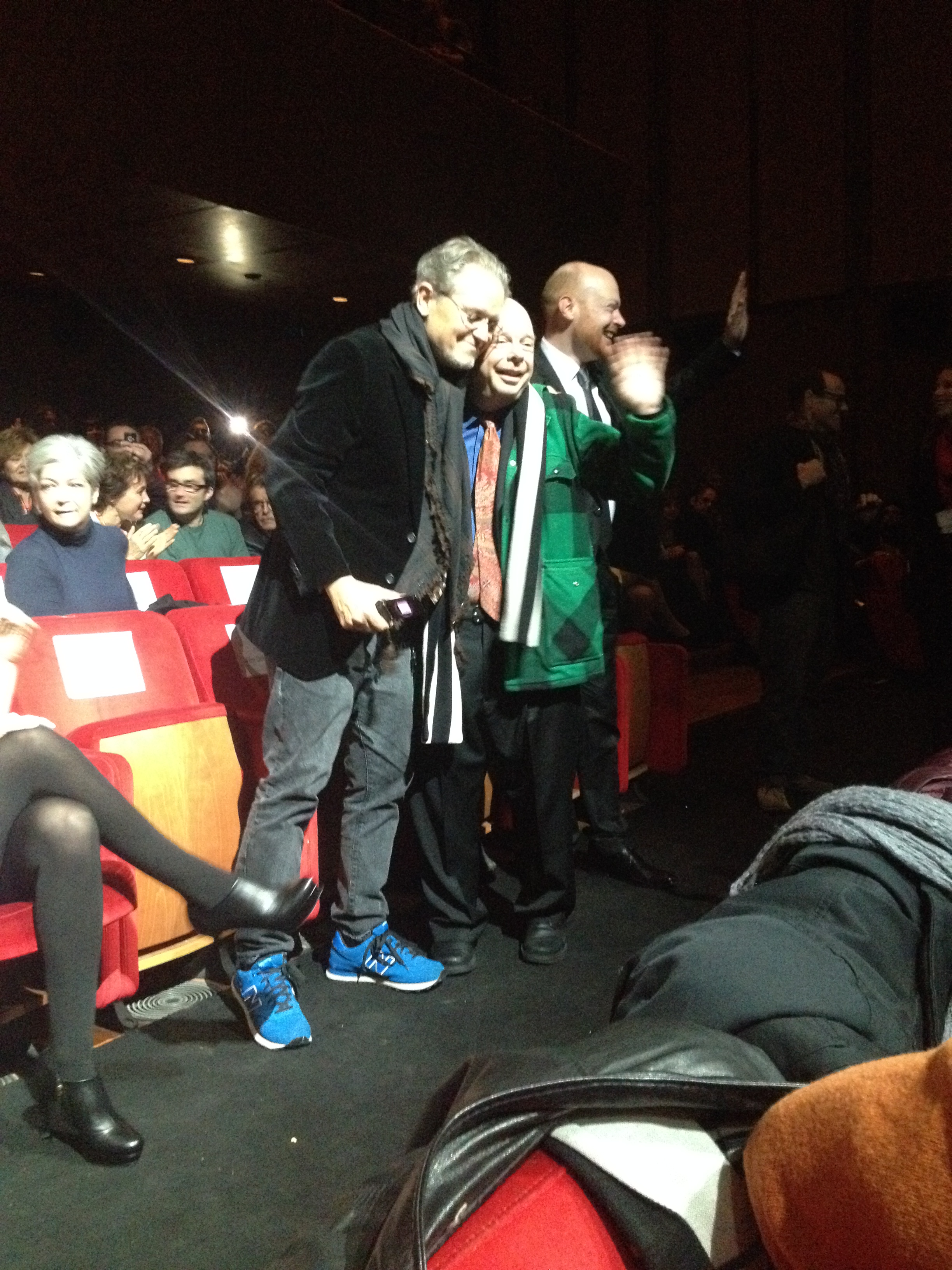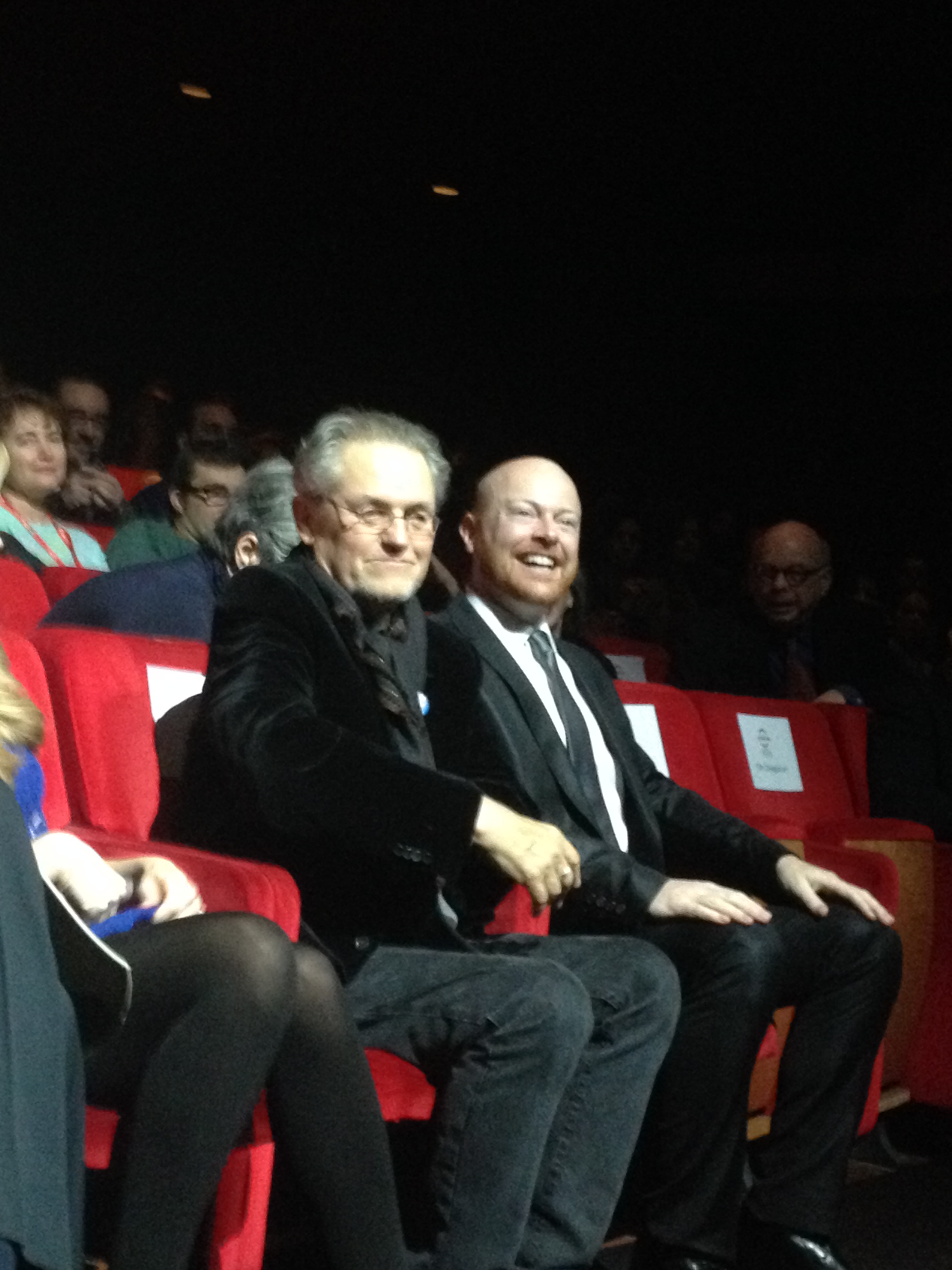 Jonathan Demme e Wallace Shawn ringraziano il pubblico al termine della proiezione di Fear of Falling, al Festival del Film di Roma. Il film è un adattamento (a cura di Shawn e André Gregory) de Il costruttore Solness di Ibsen. Cinema al servizio del teatro. Non a caso con dedica a Louis Malle, nel cui Vanya sulla 42a strada (che Fear of Falling ricorda per intensità e prova collettiva, sebbene avanzando verso il finale qualcosa se ne perda e l’ipnosi stupita dello spettatore si dissipi un poco, ma solo un poco) sia Shawn, sia André Gregory e Larry Pine (anche qui interpreti) recitarono. Shawn compie gli anni questa notte, ne fa 70 e festeggia in sala e «che peccato che Ibsen sia morto e non possa festeggiare qui con noi» (dice suppergiù, non letteralmente). Nel film dona a Solness grazia, ironia, straniamento. Ma tutti gli attori sono in stato di grazia: oltre a Shawn e Gregory e Pine, Lisa Joyce (anche lei in sala ad augurare buon compleanno), Julie Hagerty, Jeff Biehl (seduto accanto al regista, vedi foto sotto), Emily Cass McDonnell. Shawn e Gregory stanno portando in scena Il costruttore Solness da quasi 15 anni. In questo video amatoriale do un senso alla posizione privilegiata che l’acquisto di un biglietto per Fear of Falling mi ha casualmente offerto. Ho infatti assistito al film a un metro o due dal suo regista, The Amazing Jonathan Demme (il che, per uno della mia generazione, che Il silenzio degli innocenti lo vide nel buio della sala cinematografica, non è evento da poco; anzi è un’emozione). Infine, in un profluvio di «thank you! Thank you! Happy birthday to you!», si rincasa felici e contenti.