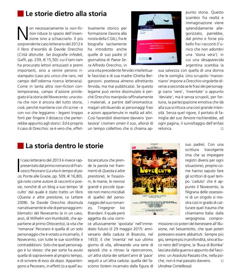 «Non necessariamente la non-fiction riduce lo spazio dell’invenzione sino a schiacciarlo. Il più sorprendente caso letterario del 2012 è il libro d’esordio di Davide Orecchio (Città distrutte. Sei biografie infedeli, Gaffi, pp. 239, € 15,50): cui il tam-tam ha procurato lettori entusiasti e premi importanti, sino a venire persino ristampato (caso più unico che raro, nel campo dell’odierna ricerca letteraria).»