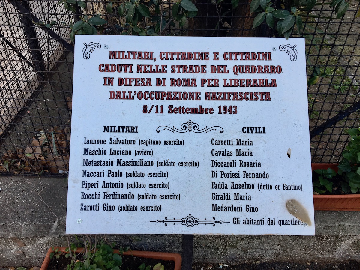 22) 17 aprile 1944. Nel quartiere del Quadraro, dove la Resistenza antifascista è forte e ostinata, le truppe tedesche guidate da Kappler rastrellano 1500 uomini casa per casa. Oltre 900 di loro sono deportati in Germania. Più di 350 non torneranno. È un messaggio chiaro e feroce ai romani: l’intera popolazione è ostaggio delle truppe tedesche. Nessuno può considerarsi al sicuro. Nessuno può nascondersi nelle zone grigie dell’attesa e della neutralità. Nella foto (di Davide Colella): una targa al Quadraro ricorda i caduti dell’8-11 settembre 1943.