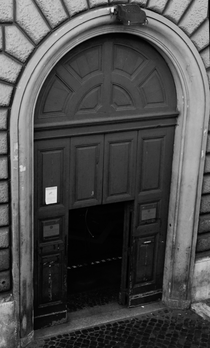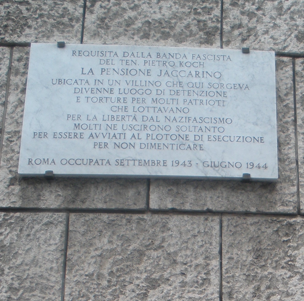 23) Via Romagna 38, nel quartiere Ludovisi. Intorno al 21 aprile 1944 la Banda Koch si trasferisce dalla pensione Oltremare alla pensione Jaccarino, in una villa lussuosa che oggi non c’è più, abbattuta negli anni cinquanta del novecento e sostituita da un edificio moderno. Qui la banda perfeziona indisturbata le sue tecniche di tortura, con la disposizione di un intero edificio dove nessun vicino può “lamentarsi” o disturbare. Da qui, il 28 aprile, Franco Calamandrei fugge quasi per miracolo, calandosi dalla finestra di un bagno, e poi allontanandosi su via Sardegna “come un cittadino qualsiasi”. Nella foto: il nuovo edificio e la targa che ricorda la pensione Jaccarino.