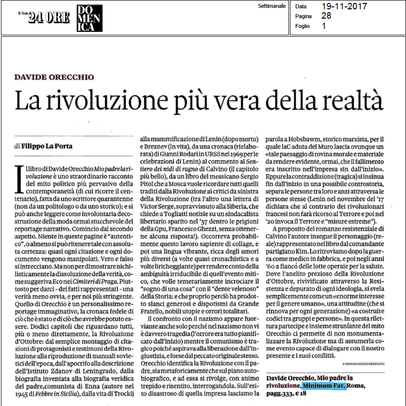 Il Domenicale del 19 novembre pubblica una recensione di Filippo La Porta a Mio padre la rivoluzione. Qui resto senza parole e grato, anche per il rilievo dato al capitolo sul Partigiano Kim, per me niente affatto secondario.