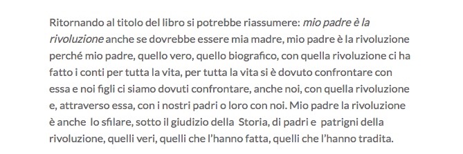 Più che una recensione è un saggio critico, quello scritto da Andrea Cabassi per Giuditta Legge, che parte da Mio padre la rivoluzione per suggerire spunti, testi, interpretazioni, approfondimenti. È uno scritto di raffinatezza notevole. Di meglio, a una lettura, un libro non potrebbe chiedere: