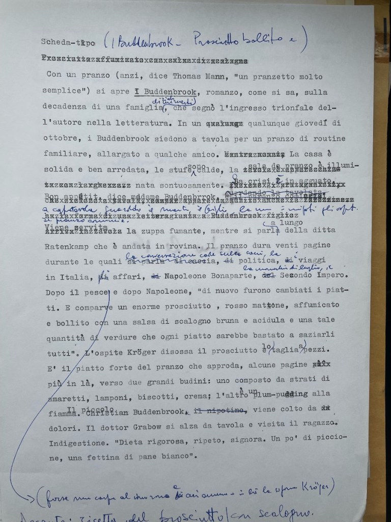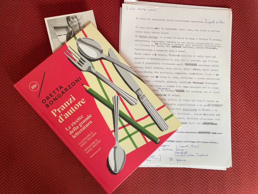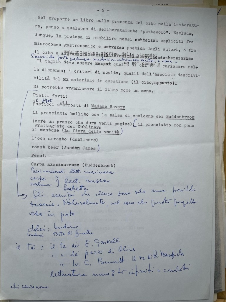 Tra di esse (quaderni di appunti, bozze di articoli, poesie) ho trovato una cartella che riguarda Pranzi d’autore. Contiene ciò che oggi definiremmo Proposal: il progetto del libro proposto all’editore prima del via libera, del contratto e di mettersi al lavoro. Cartelle scritte a macchina (sulla Olivetti verde, un giorno ve la farò vedere), corrette in bozza, riscritte, appuntate in corsivo.