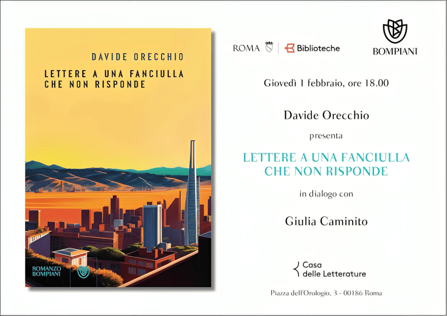 Due presentazioni della «Fanciulla»: Roma e Firenze ll 1 febbraio a Roma, Casa delle Letterature, ore 18, con Giulia Caminito. Il 2 febbraio a Firenze, Biblioteca delle Oblate, ore 18.30, con Alessandro Raveggi. Condividi Fai clic per inviare un link a un amico via e-mail (Si apre in una nuova finestra) E-mail Fai clic qui per stampare (Si apre in una nuova finestra) Stampa Fai clic qui per condividere su Tumblr (Si apre in una nuova finestra) Tumblr Fai clic per condividere su X (Si apre in una nuova finestra) X Fai clic per condividere su Facebook (Si apre in una nuova finestra) Facebook Fai clic per condividere su WhatsApp (Si apre in una nuova finestra) WhatsApp Mi piace Caricamento... Correlati Pubblicato il 28 gennaio 20245 febbraio 2024 Inviato su Leggere/ScrivereTag bompiani, Lettere a una fanciulla che non risponde