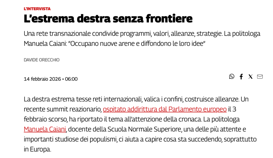 “La transnazionalizzazione dei partiti e dei movimenti sociali illiberali – esordisce Caiani – non è un fenomeno nuovo, ma è certamente in accelerazione nel 21esimo secolo, ed è sempre più evidente in Europa. Questi soggetti non sviluppano solo reti transnazionali, ma le loro idee si diffondono oltre i confini grazie a internet e alle piattaforme di social media. Attori anti-immigrazione e anti-gender si riuniscono in eventi a livello internazionale, favorendo la diffusione di strategie e cornici interpretative escludenti, e contribuendo all’apprendimento reciproco. Finora la ricerca si è concentrata su temi specifici (odio per i migranti e per i diritti gender, singoli partiti e movimenti). Ma a questo punto credo che la sfida sia un’altra”.