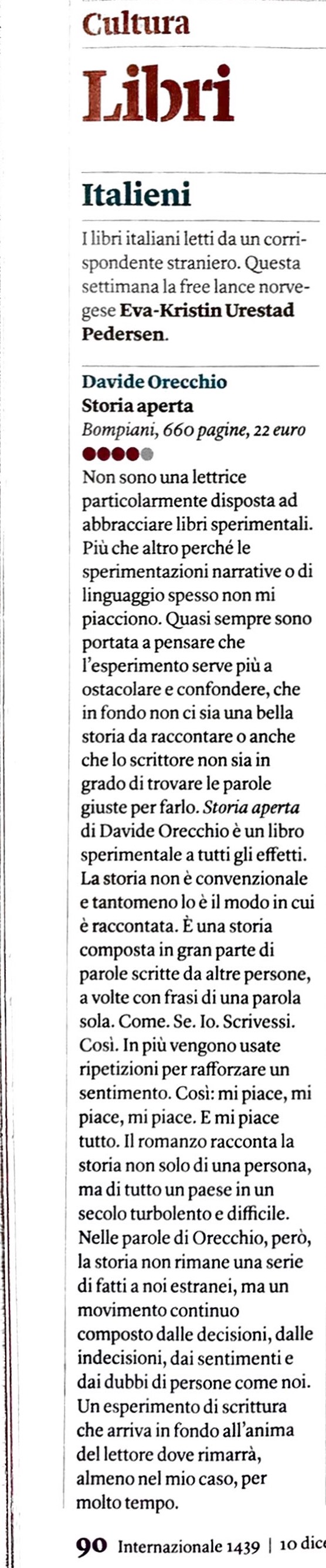 Eva-Kristin Urestad Pedersen su “Storia aperta” Internazionale Un esperimento di scrittura che arriva in fondo all’anima del lettore dove rimarrà, almeno nel mio caso, per molto tempo. 10 dicembre 2021