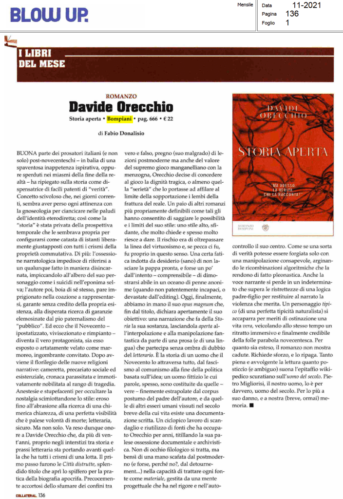 Un ciclopico lavoro di scandaglio e riutilizzo di fonti … nella capacità di trattare ogni fonte come materiale, gestita da una mente progettuale che ha nel rigore e nell’autocontrollo il suo centro. Per quanto sia esteso, il romanzo non mostra cadute. Richiede sforzo, e lo ripaga.