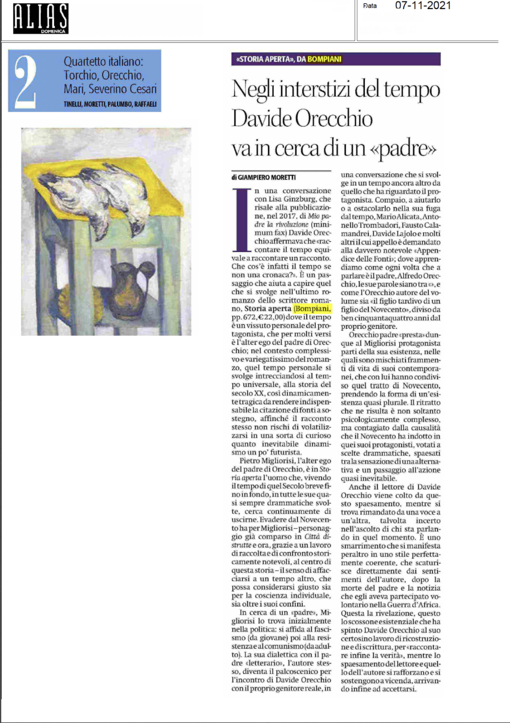 «Pietro Migliorisi, l’alter ego del padre di Orecchio, è in Storia aperta l’uomo che, vivendo il tempo di quel Secolo breve fino in fondo, in tutte le sue quasi sempre drammatiche svolte, cerca continuamente di uscirne. Evadere dal Novecento ha per Migliorisi – personaggio già comparso in Città distrutte e ora, grazie a un lavoro di raccolta e di confronto storicamente notevoli, al centro di questa storia – il senso di affacciarsi a un tempo altro, che possa considerarsi giusto sia per la coscienza individuale, sia oltre i suoi confini».