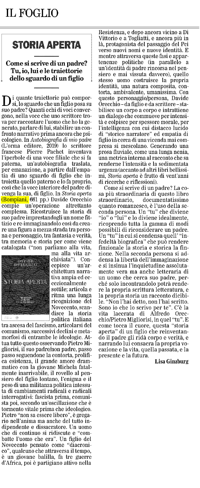 Un libro straordinario. Concepisce un’architettura narrativa ampia ed eccezionalmente sottile; articola e ritma una lunga ricognizione del Novecento, scandisce la storia politica italiana tra ascesa del fascismo, articolarsi del comunismo, successivi declini e metamorfosi di entrambe le ideologie. Attua tutto questo osservando Pietro Migliorisi, il suo padre/non padre, passo passo seguendone la contorta, prolifica esistenza.