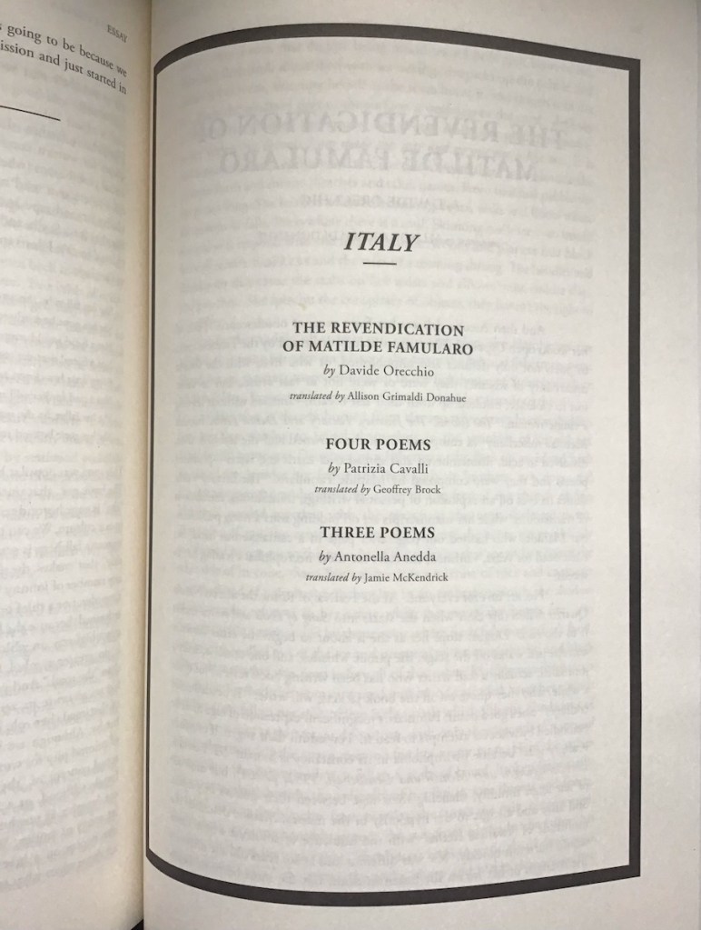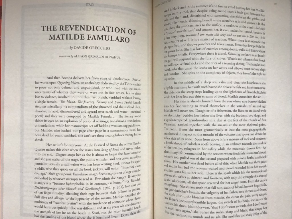 Mentre scrivevo la “Rivendicazione di Matilde Famularo” (uscita su Nuovi Argomenti nel 2009) non sapevo, non immaginavo che un giorno la lingua italiana della storia avrebbe traslocato dalla forma di una zucca a quella di una carrozza inglese. Ma è successo, grazie a The American Reader che ha pubblicato il racconto negli Stati Uniti (su carta, nel numero di febbraio-marzo 2013, e su web) e a Allison Grimaldi-Donahue che l’ha tradotto così bene.