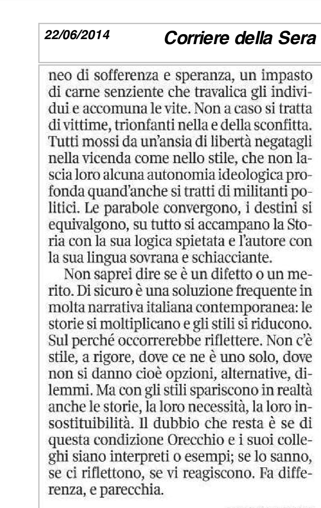 Negli stessi giorni leggevo i contributi ospitati dalla rivista Lo Straniero su scrittori e storia, un’inchiesta sui “nostri ieri” che ora diventerà un libro. Contributi che raccontano un rapporto serio, responsabile, onesto (a me sembra) col nostro passato prossimo. Allora mi chiedevo: ha ragione Luzzatto? È venuto il momento di smetterla? Dobbiamo lasciare in pace la storia? Non dobbiamo “torturare” la storia con marchingegni diseducativi? Oppure il fatto che molti scrittori si volgano alla storia è “sintomo” da prendere sul serio, oltre che un lavoro che dà frutti non avvelenati ma, appunto, quantomeno onesti?