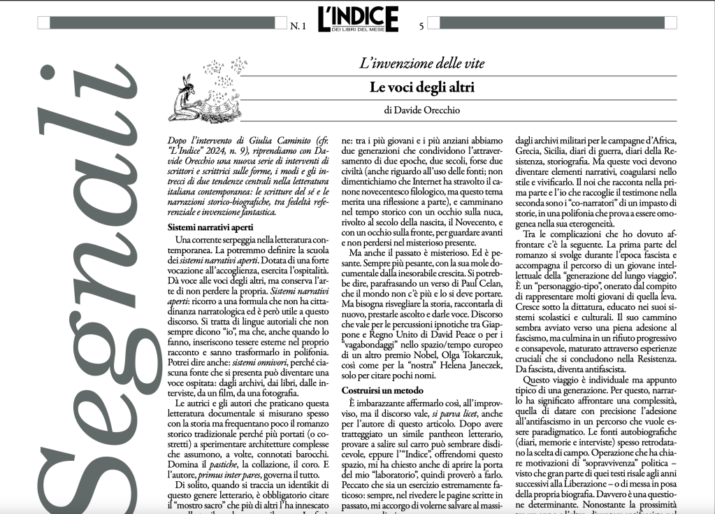 Ringrazio L’Indice dei libri del mese per l’invito a ragionare su “scritture del sé e narrazioni storico-biografiche”. È una serie che ha già ospitato l’intervento di Giulia Caminito, e altri seguiranno. L’articolo è uscito sul numero 1 di gennaio fresco di stampa, e sul sito dell’Indice in consultazione senza lucchetto.